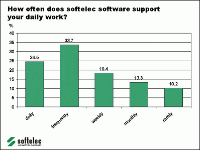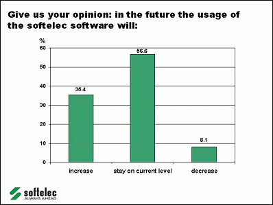 Users prognosticate increasing demand for softelec software Munich, September 20, 2004: Recent user poll shows promising market perspectives for Munich based raster software specialist More than one third of softelec users estimate an increase in requirements to apply their raster software in the next few years. The largest potential can be foreseen in graphic services, in GIS related applications, and in the mechanical industry. These are the major results of a recent research study initiated by softelec. A specialist in software development of raster, hybrid, and vector conversion technology since the early 1990s softelec's future looks bright. More than 90 percent of their clients predict that using the software will at least stay stable on the current level. About 38 percent even expect an increase in demand. High Potential Industry Sectors In some industrial sectors even above average requirements are estimated. Particularly scan and drafting service providers as well as users from geographical applications and in the mechanical industry see a growing demand compared to the current status. This has been expressed by more than 40 percent of these users. "The figures point out quite clearly that we have been right with our product strategy. Obviously, we are successful in fulfilling user requirements and market needs", resumes Stefan Horvatin, managing director of softelec. The poll results prove that softelec's software has become an indispensable tool for many companies and is applied frequently. 25 percent of all respondents are making use of it on a daily basis. One third have stated to run it frequently and constantly. 18 percent use the software on a weekly basis. Thus, more than three quarters of all users are applying softelec programs at least once a week. "From discussions with clients we were aware that our products often have a major significance for key tasks in a company. Now the results of the poll bring even more evidence for this", says Horvatin. The most active users are found at graphic service providers and in Facility Management applications.